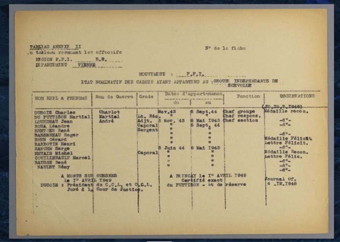 La liste fiable est celle datée du 1er avril 1949, établie à Monts-sur-Guesnes par Dubois Président du CCL et CCL[2] (sic) juré à la Cour de Justice, certifiée exacte par du Puytison Lt de réserve. Charles Dubois et Martial Du Puytison sont les deux chefs incontestés du groupe. Cette liste comporte 13 noms : Deux chefs de groupe, un chef de section et dix hommes.