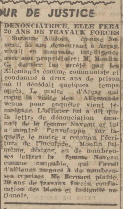 Quant à Suzanne Naveau, elle est envoyée le 19 mars 1945 devant la Cour de justice de Poitiers pour avoir, à Arçay, au mois de mars 1943, entretenu en temps de guerre des intelligences avec une puissance étrangère ou avec ses agents, en vue de favoriser les entreprises de cette puissance contre la France.