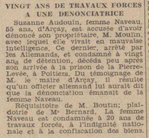 Quant à Suzanne Naveau, elle est envoyée le 19 mars 1945 devant la Cour de justice de Poitiers pour avoir, à Arçay, au mois de mars 1943, entretenu en temps de guerre des intelligences avec une puissance étrangère ou avec ses agents, en vue de favoriser les entreprises de cette puissance contre la France.